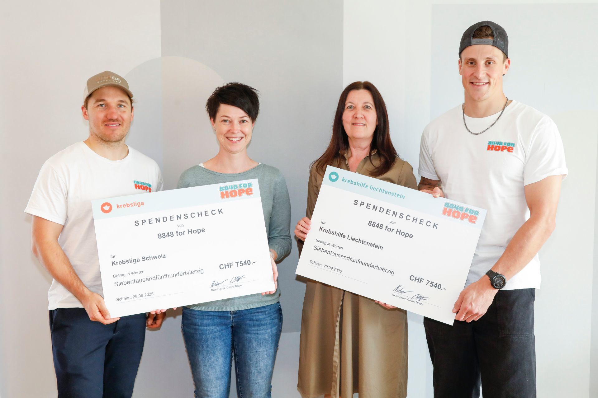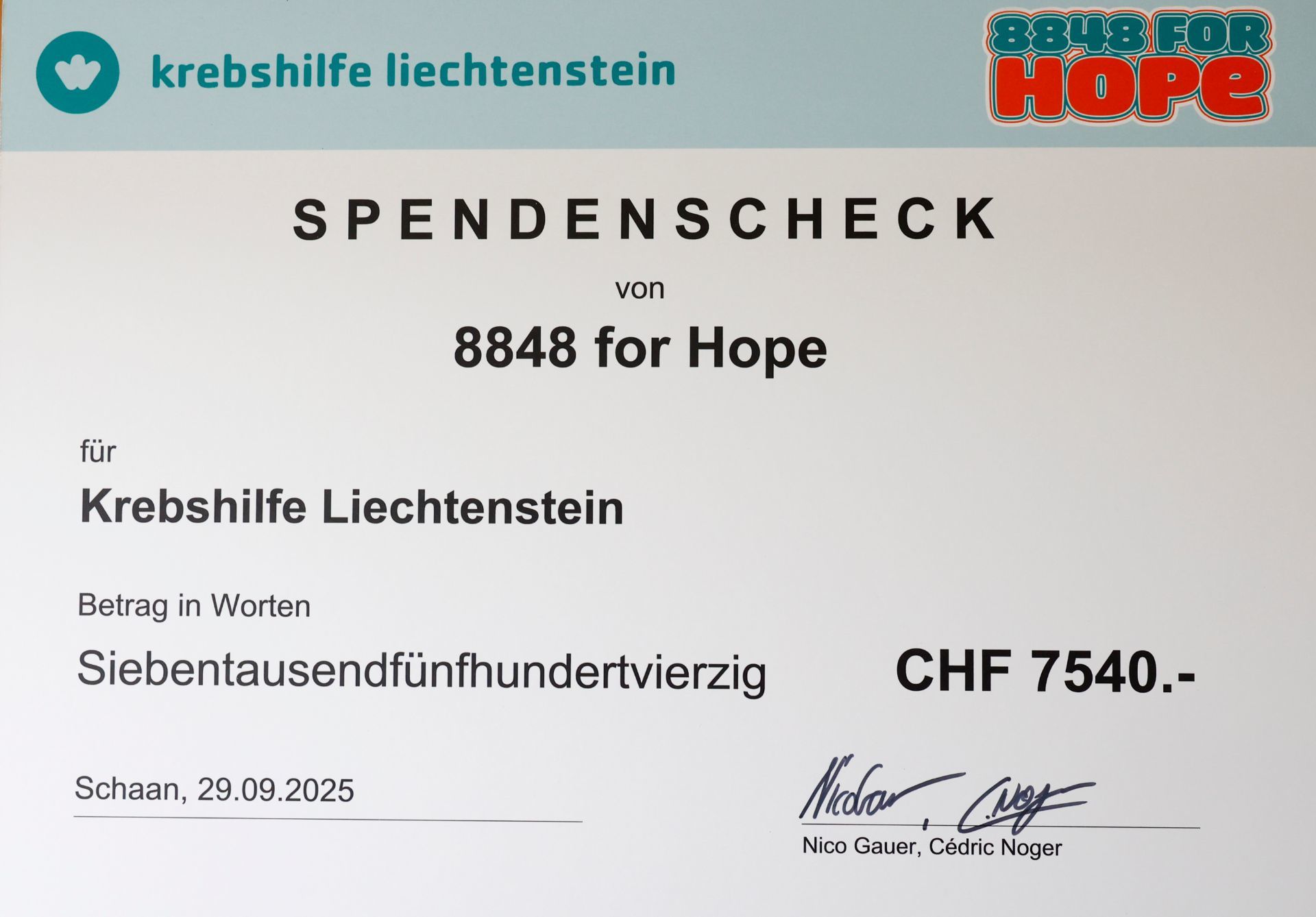 Unter dem Slogan «8848 for Hope» stellten sich Cédric Noger und Nico Gauer am 23. Juli dieses Jahres einer ganz besonderen Herausforderung: Eine Everesting-Challenge mit dem Rennrad am legendären Mont Ventoux mit dem Ziel, 8848 Höhenmeter an einem Tag – das ist die symbolische Höhe des Mount Everest – zu schaffen. Sie erklommen diese 8848 Höhenmeter und 257.68 Kilometer in nur 15 Stunden und 19 Minuten! Mit ihrer Aktion wollten sie nicht nur ihre eigenen Grenzen verschieben, sondern auch Hoffnung schenken. Sie sammelten insgesamt CHF 15'080.00 an Spendengeldern und übergaben am 29. September je die Hälfte an die Krebshilfe Liechtenstein und die Krebsliga Schweiz. Ein grosses Dankeschön an Cédric und Nico und an alle, die mitfieberten und spendeten!